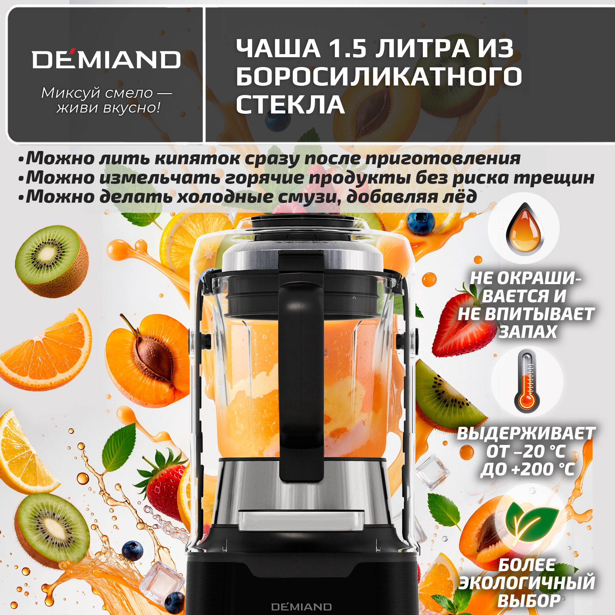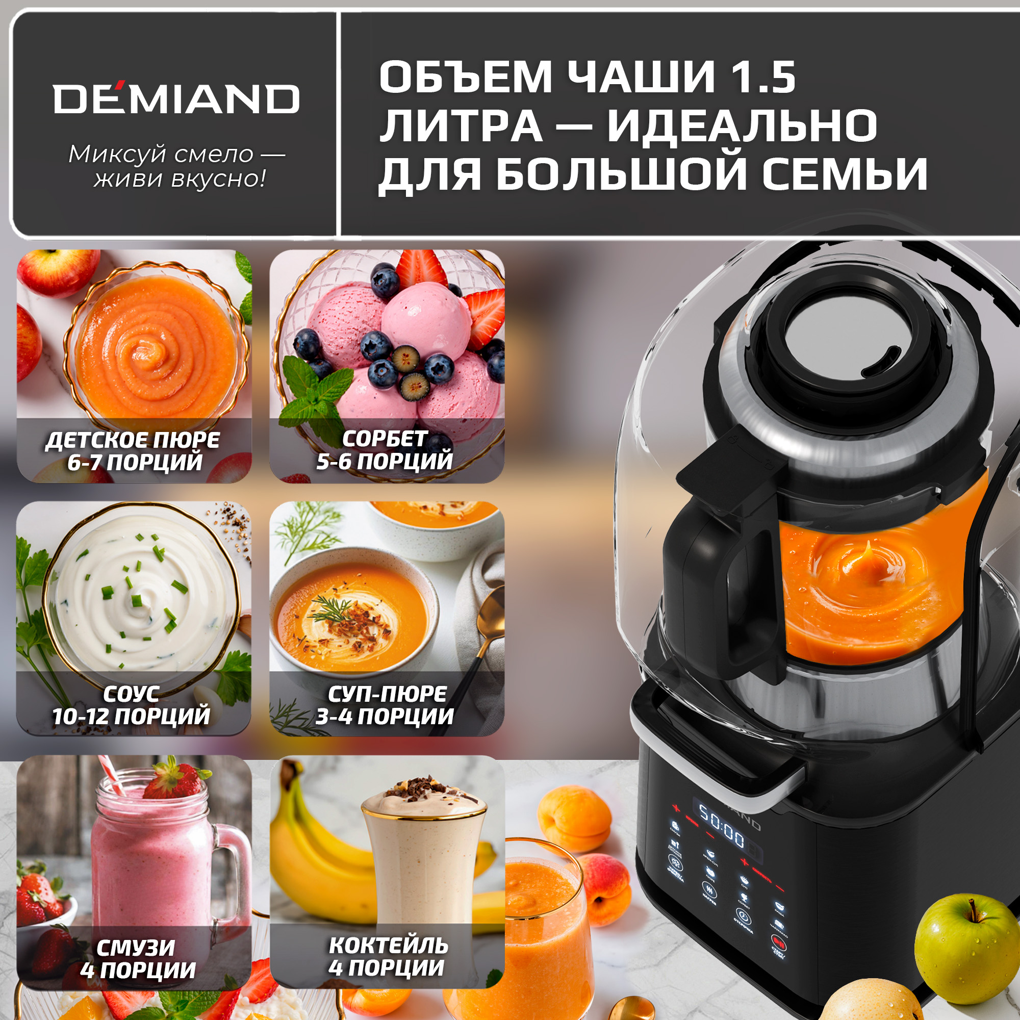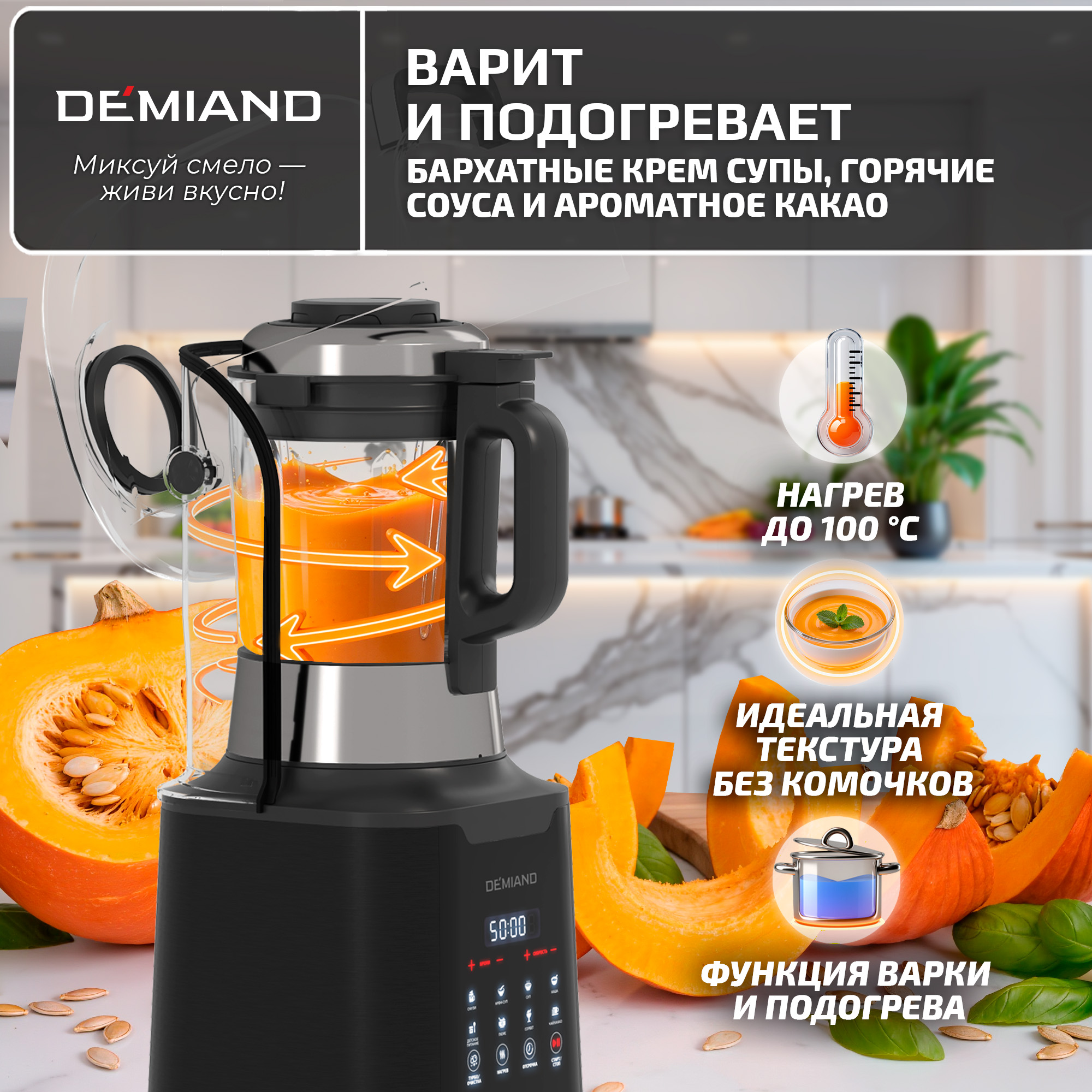 Блендер-суповарка DeMixi 7 в 1, с нагревом до 100°С; с технологией умного измельчения XBlade Ultra; со скоростью 27.000 оборотов/мин; с функцией приготовления супов, смузи, детского питания и колки льда; со стеклянной чашей на 1,5 л; шумоизоляционной крышкой до 60дБ; 6-лопастным ножом; функцией самоочистки; отложенным стартом до 12 часов; системой безопасности Smart Lock; импульсным режимом; кулинарной книгой Lifestyle-гид 100+ рецептов; 1250Вт, BL-1200/Черный