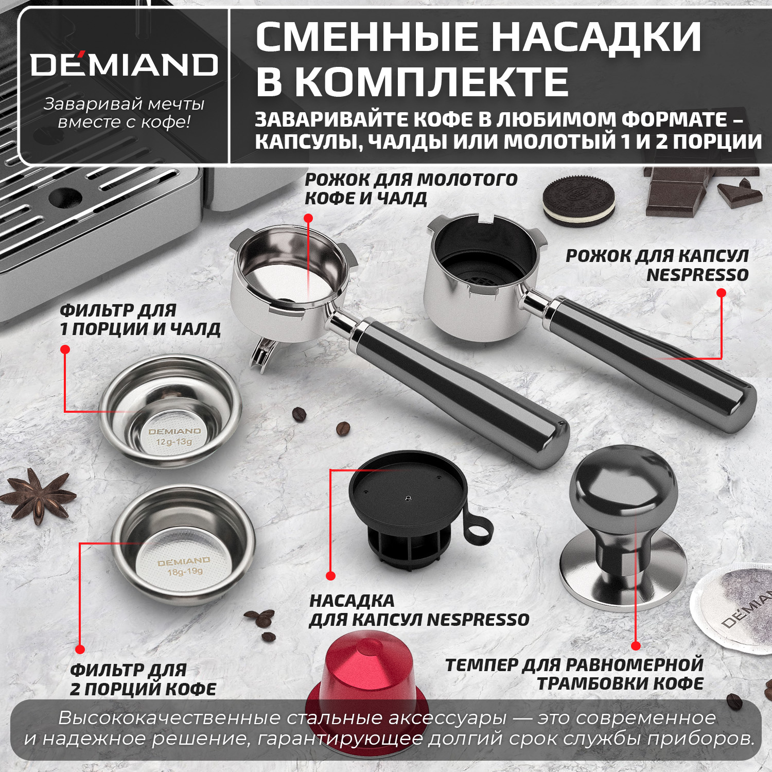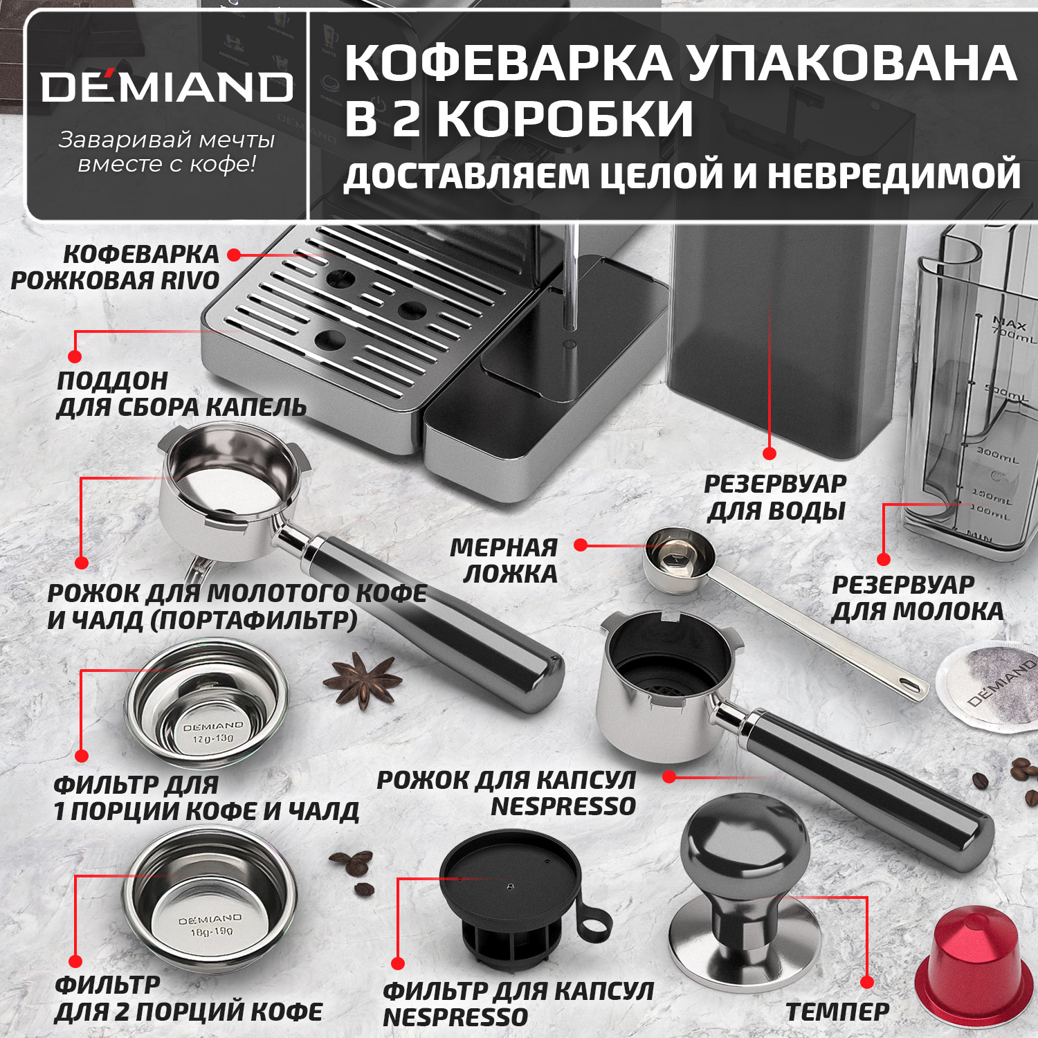 Кофеварка рожковая DEMIAND RIVO 7 В 1 с автоматическим капучинатором; с 7 программами приготовления: эспрессо, холодный эспрессо, американо, капучино, латте, флэт уайт, самоочистка и очистка от накипи; выбор объема кофе; точный контроль температуры экстракции; с 2-мя сменными рожками — для молотого кофе и чалд, для капсул Nespresso; 2 сменных фильтра в комплекте – для одной порции кофе и чалд, для двойной порции; сенсорное управление; LED-дисплей; мощность 1500 Вт; резервуар для воды 1,6 л; резервуар для молока 0,7 л; книга бариста в подарок; KF-3500