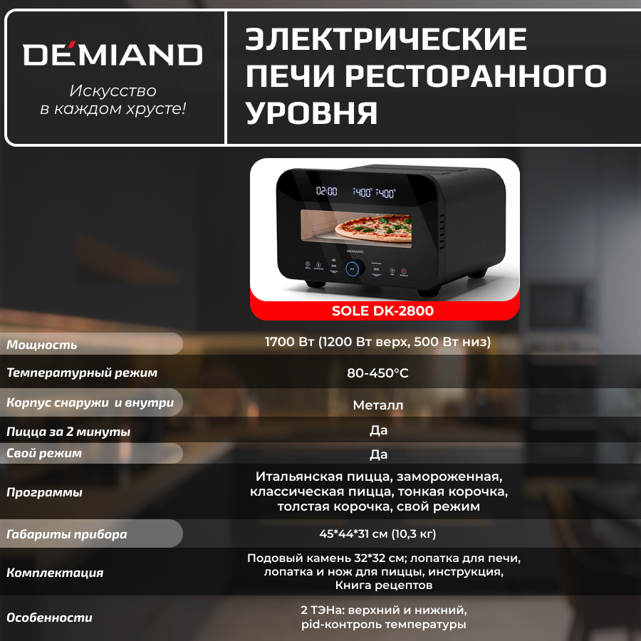Аэрогриль DEMIAND – это многофункциональный прибор, сочетающий в себе 5 бытовых приборов: фритюрницу, микроволновую печь (без СВЧ-излучений), гриль, духовку и мини-печь (ростер).