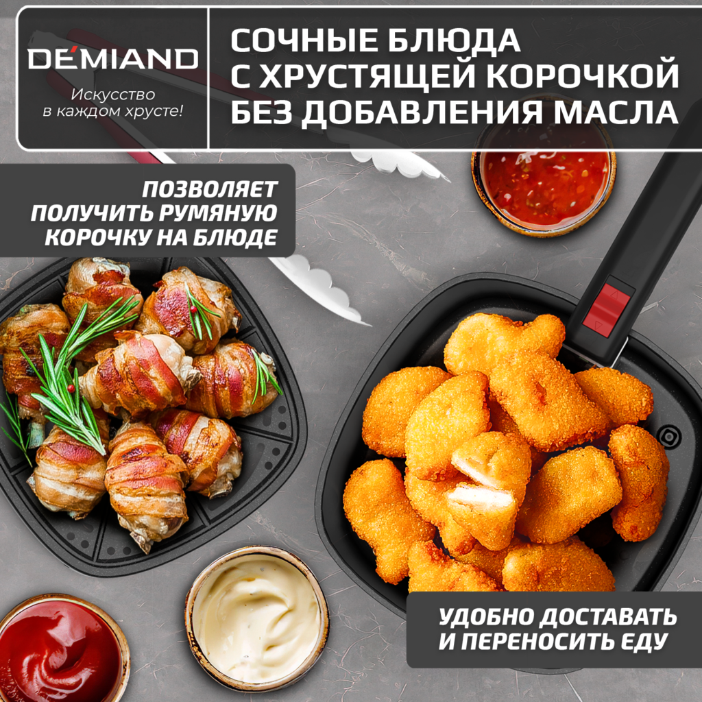 Аэрогриль DEMIAND – это многофункциональный прибор, сочетающий в себе 5 бытовых приборов: фритюрницу, микроволновую печь (без СВЧ-излучений), гриль, духовку и мини-печь (ростер).