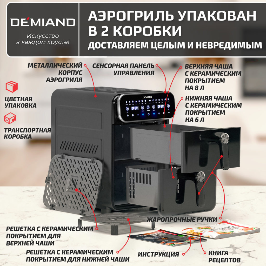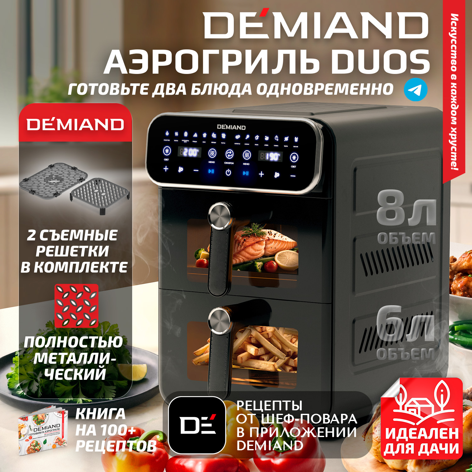 Аэрогриль с двумя чашами DEMIAND DUOS с горячим обдувом воздуха на 360°, чаши на 8 литров и 6 литров, 14 программ, функция поддержания тепла, дегидрация, подогрев, разморозка, визуальное окно, сенсорная панель, съемные решетки с керамическим покрытием, верхняя чаша 1700W и нижняя чаша 1500W, внутренняя камера из стали, стальной корпус, книга рецептов, DK-2100, черный